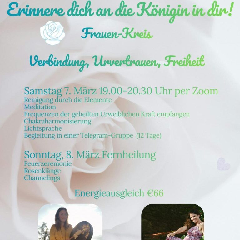 Wir begleiten dich auch am 2. Tag in deine weibliche Urkraft. Während eines Live-Channelings werden Lichtcodes und/oder Worte empfangen.